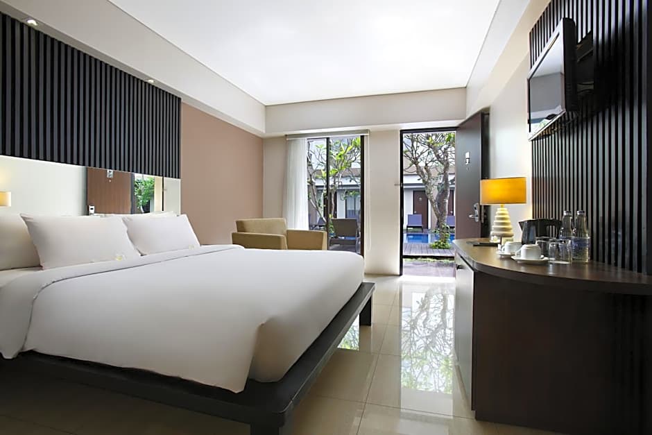 King room fitted with air conditioning, flat-screen cable TV and a safety box. There is also a mini fridge with complimentary bottled water, a desk, a chair and a multi functional cabinet. Private bathroom comes with a hot and cold standing shower and amenities. The room has direct access to swimming pool. Free WiFi is available.